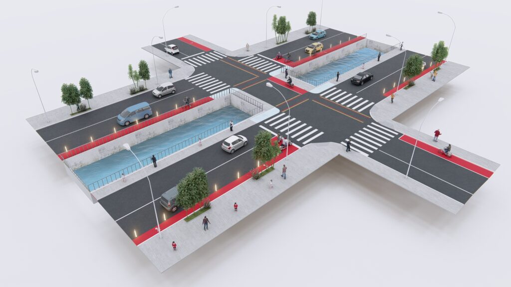 O tratamento de interseções como espaço urbano qualificado e não apenas como ponto de cruzamento de fluxos, contribui para a redução de conflitos, melhoria da legibilidade viária e valorização do entorno.